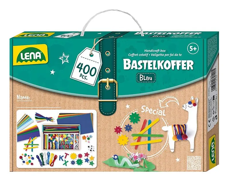 LENA Bastelkoffer, blau. Der Bastelkoffer enthält buntes Papier, Moosgummiteile, Pfeifenreiniger, Wackelaugen, Pompons, bunte Eisstiele und vieles mehr in verschiedenen Blau- und Grün-Farbtönen. 400 Teile. Geeignet für Kinder ab 5 Jahren. Verpackt in Faltschac...