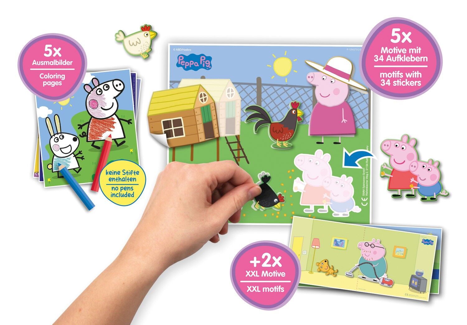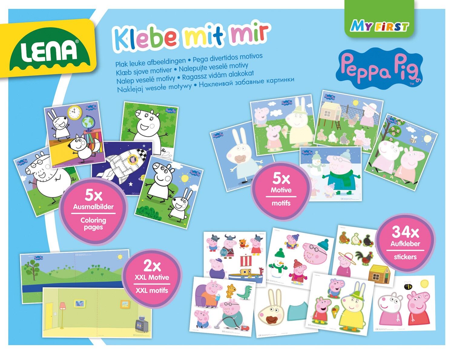 LENA Klebe mit mir Peppa Pig. Komplettset mit 2 großen Peppa Pig Motiven zum Bekleben mit Stickern + 5 Motive zum Vervollständigen durch Sticker. Inkl. 5 zusätzlicher Motive zum Ausmalen. Set gestaffelt in 3 Schwierigkeitsgrade. Für Kinder ab 3 Jahren. Verpack...
