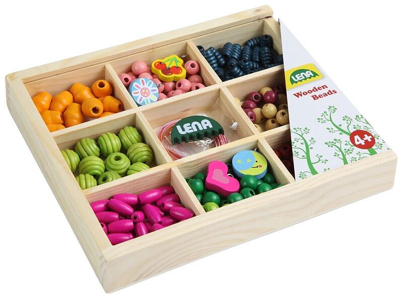 Holzperlen Holzkassette, mittel LENA® Holzperlen Holzkassette, mittel, bestehend aus 290 bunten Holzperlen, jeweils 1x Anhänger Herz, Mond, Kirsche, Blume und LENA® Logo sowie bunte Fädelschnüre. Geeignet für Kinder ab 4 Jahren. Verpackt in wiederverschließbar...