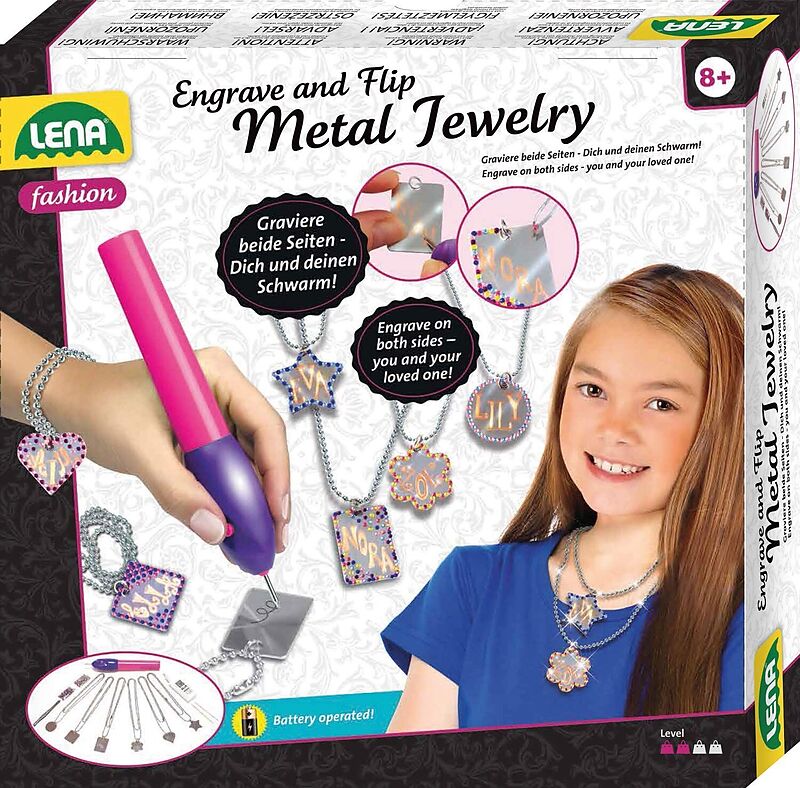 Fashion Metal Jewelry, Faltschachtel LENA® Metal Jewelry. Komplettset enthält 6 Metall-Anhänger mit Kette, ein hochwertiges Gravurgerät (geeignet für weiche Metalle, Holz und Kunststoff), bunte Strasssteine zum Dekorieren, Kleber, eine Pinzette und Zahnstocher...