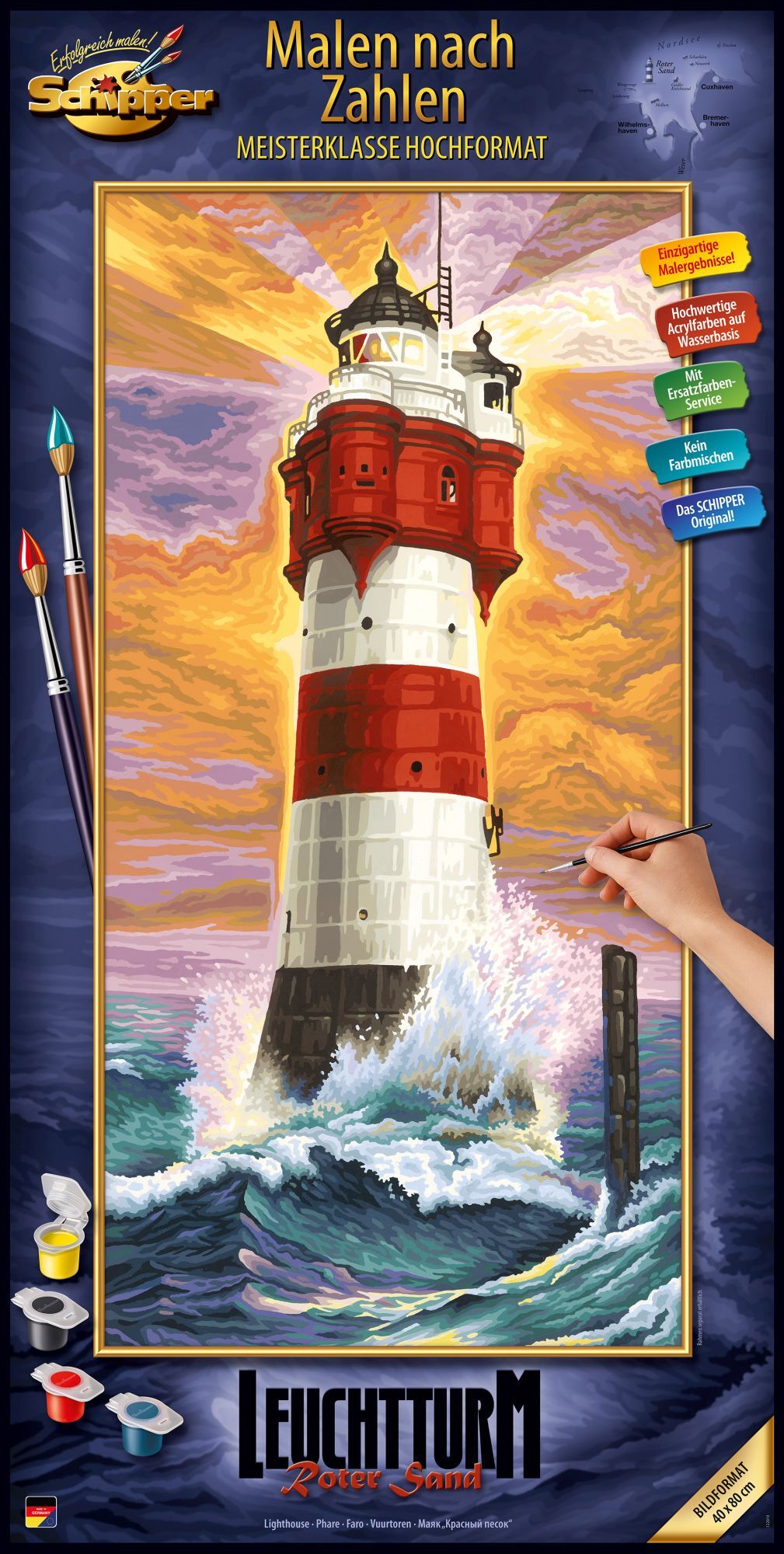 Malen nach Zahlen - Leuchtturm Roter Sand Schipper - Meisterklasse Hochformat Roter Sand steht nördlich von Wilhelmshaven. Das 28 Meter hohe Bauwerk war der allererste Leuchtturm im offenen Meer. Heute wird er von vielen Touristen besucht und zählt zu den beka...