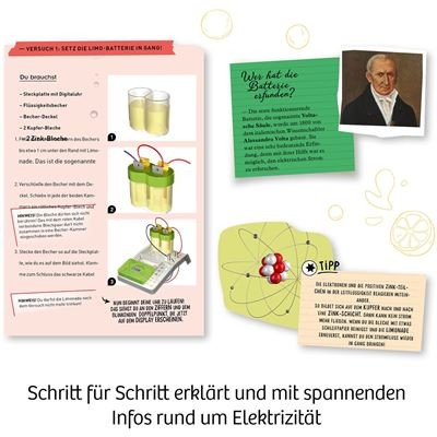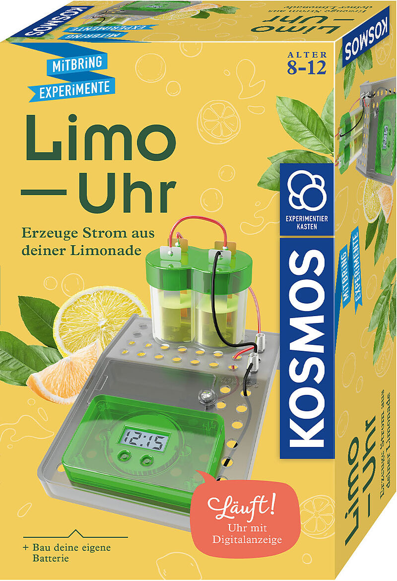 Limo-Uhr Unglaublich! Eine Digitaluhr gewinnt ihren Strom aus Limonade! Mit diesem Experimentierkasten entdecken Kinder von 8 bis 12 Jahren, dass Strom nicht immer aus der Steckdose kommen muss. Schon beim Zusammenbau der Einzelteile aus dem Elektronik-Bausatz...