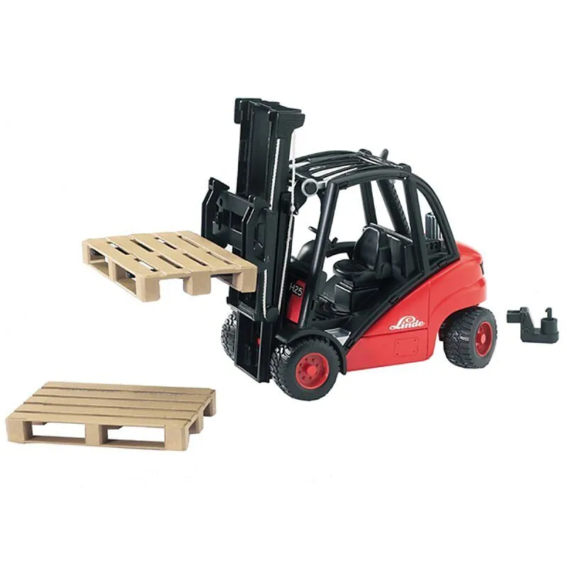 bruder 02511 Linde Gabelstapler H30D mit Anhängerkupplung und 2 Paletten Bei dem Linde Gabelstapler H30D handelt es sich um einen Industriestapler, der in Natura mit Diesel oder Gas betrieben wird. Das bestechende Original im Porsche-Design stellt eine sehr at...