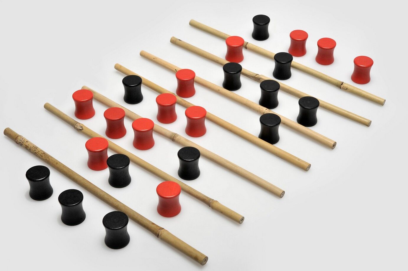 Das Spielfeld besteht aus sieben Bambusstäben, die die roten und schwarzen Spielfiguren Runde um Runde überqueren müssen. Die Bewegungsmöglichkeiten der Spielfiguren ändern sich mit jeder Runde. Der Spieler, dem es gelingt, seine Bewegungsmöglichkeiten optimal...