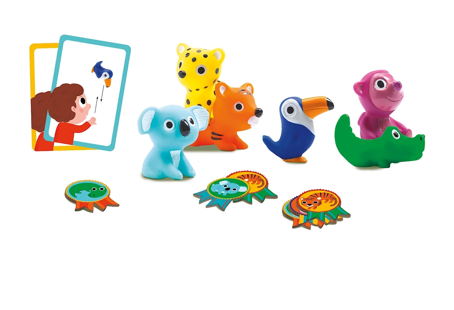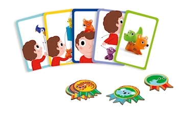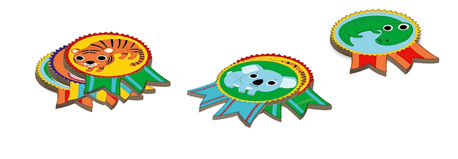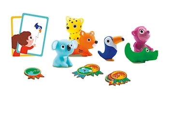 ab 2.5 Jahren 2-4 Spieler Dschungelparty! Eine Pyramide bauen, auf dem Kopf balancieren, werfen, fangen und das alles mit niedlichen Tieren. Jede gelöste Aufgabe wird mit einer Medaille belohnt
