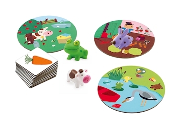 ab 2 Jahren 2-4 Spieler Der Hase lebt im Gemüsegarten, die Kuh auf der Wiese und der Frosch im Teich. Die drei grossen Mittelfeldkarten stellen jeweils einen Lebensraum dar, den das Kind mit den gezeigten Einzelkarten in Verbindung bringen soll. Wer zuerst das...