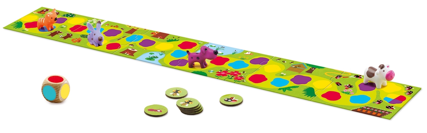 Ein lustiges Laufspiel, bei dem der Würfel entscheidet in welche Richtung man laufen muss. Würfelt man allerdings eine Biene, muss man wieder zurück zum Startfeld! Der Spieler, der den bunten Fleck zuerst erreicht, gewinnt.