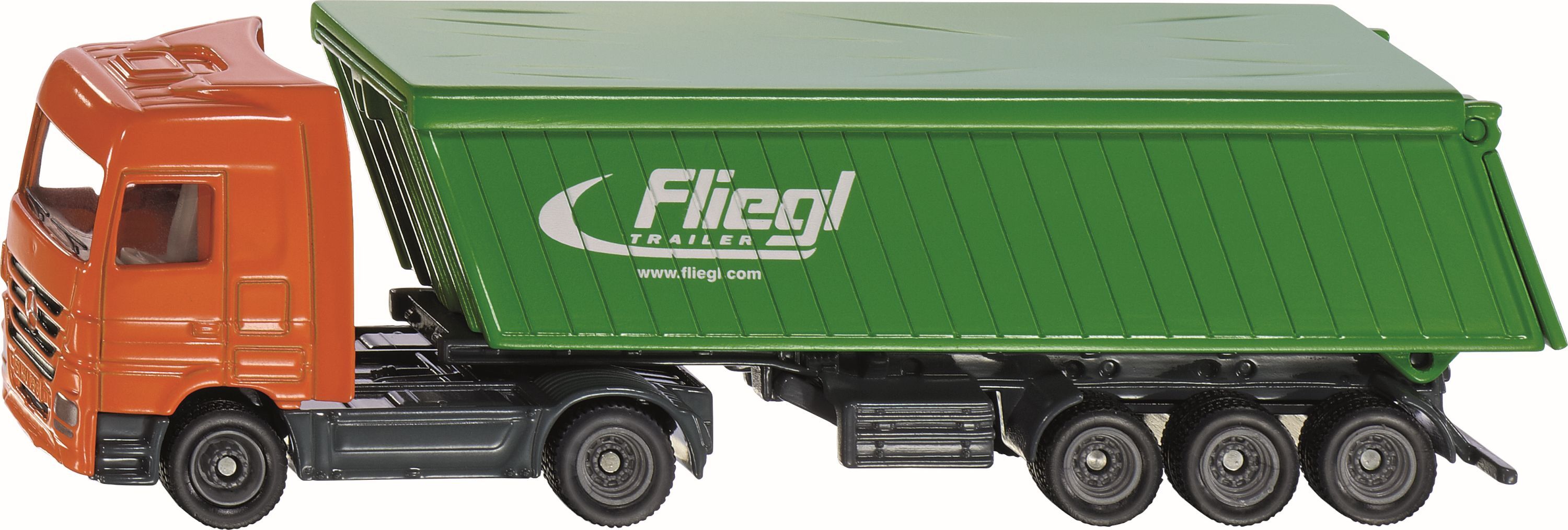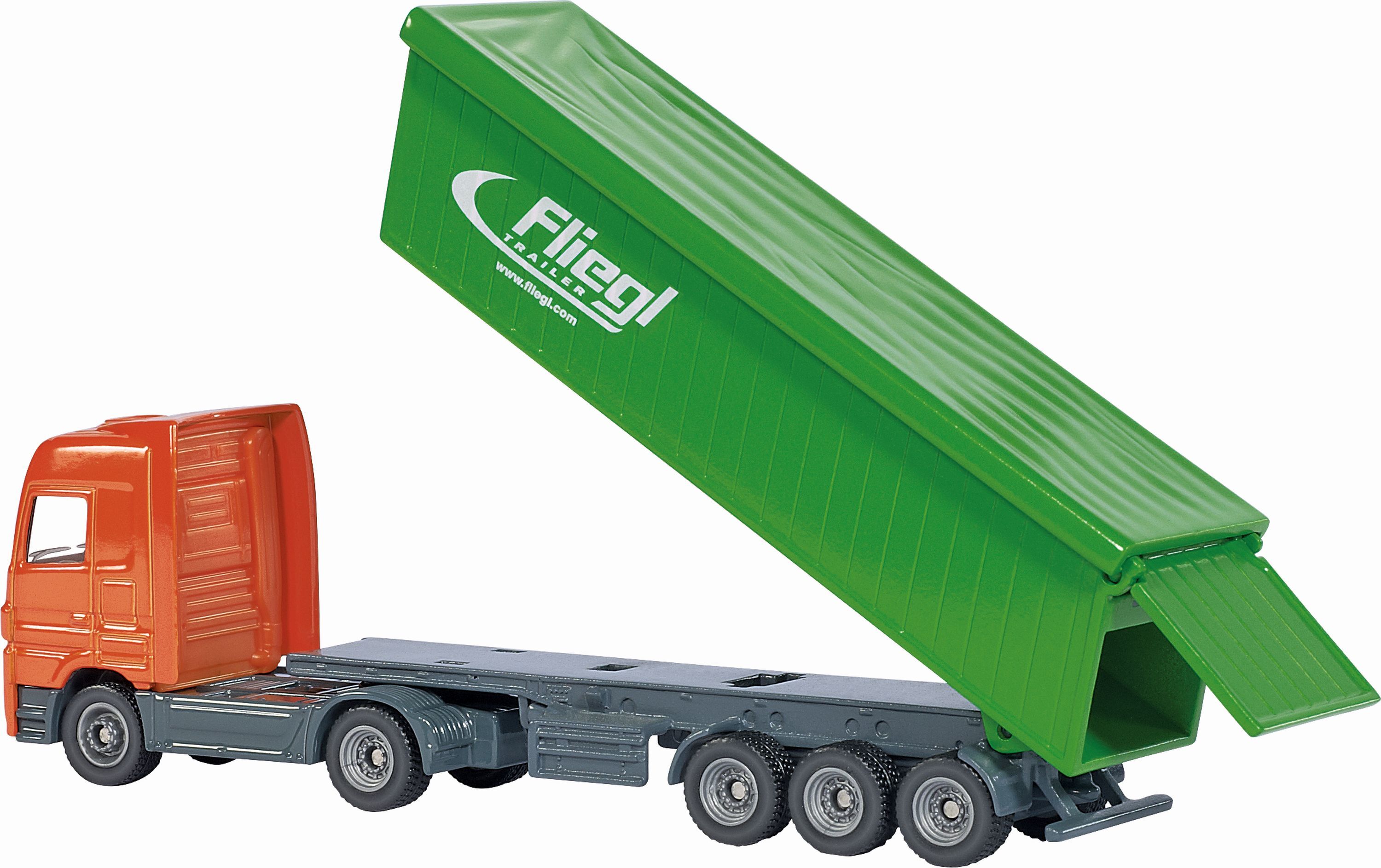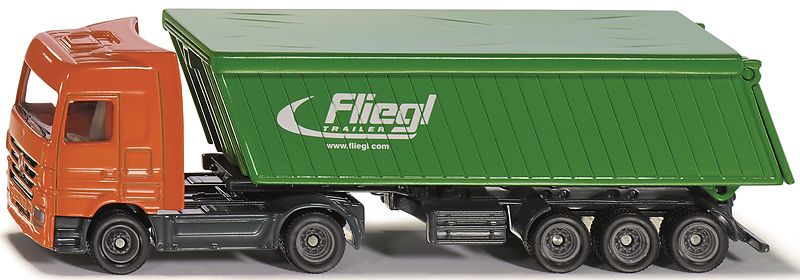 Nach den neuesten Sicherheitsvorschriften sind Schüttgüter auf LKW nur noch mit einer Plane zu fahren. SIKU setzt diese aktuelle Vorschrift auch für den Spielbetrieb um. Die Mercedes-Benz Actros Zugmaschine zieht einen 3-achsigen Kippsattel-Auflieger mit beweg...