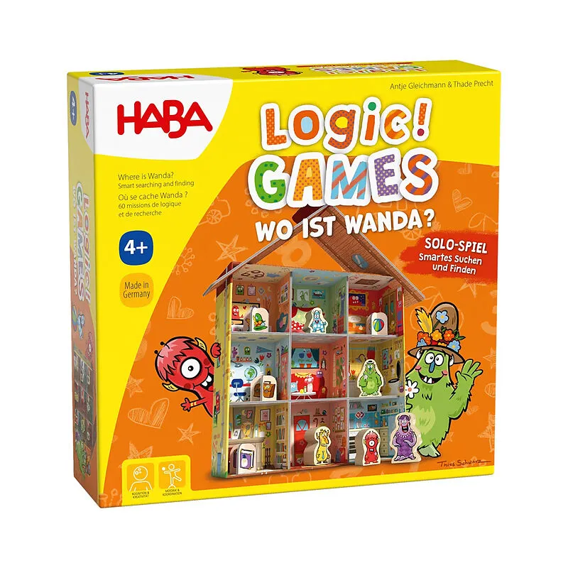 Aufgaben durch cleveres Kombinieren lösen und das kleine rote Monster finden das ist die Mission beim Logikspiel Logic! GAMES Wo ist Wanda? von HABA. Aus der Rätselbox wird im Handumdrehen ein 3D-Spiel für Kinder mit umfangreichem Spielmaterial aus Holz und Pa...