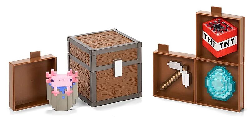 Diese Minecraft-Inventartruhe aus Serie Eins: Biome Discoveries erkundet das Höhlenbiom und enthält eine Eisenspitzhacke, TNT, einen Eimer mit Axolotl und Diamanten. Bereit, deine Beute zu präsentieren? Nutze die enthaltenen Inventarfächer, um eine Vitrine für...