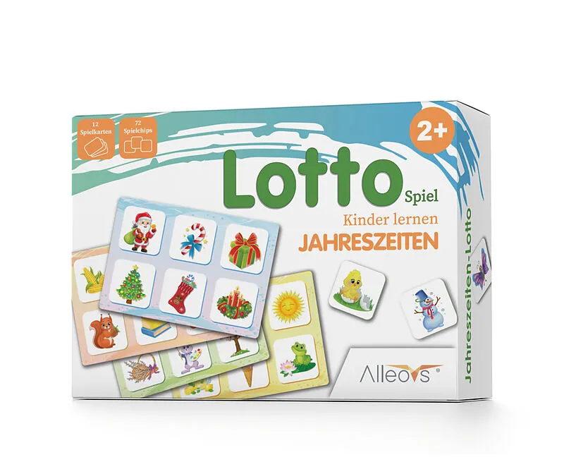 Entdecken Sie das Kinder Lotto Jahreszeiten ein pädagogisches Lernspiel für Kinder ab 2 Jahren. Mit 72 Spielchips und 12 großen Spielkarten lernen Kinder spielerisch die Besonderheiten von Winter, Frühling, Sommer und Herbst. Das Spiel fördert Gedächtnis, Fein...