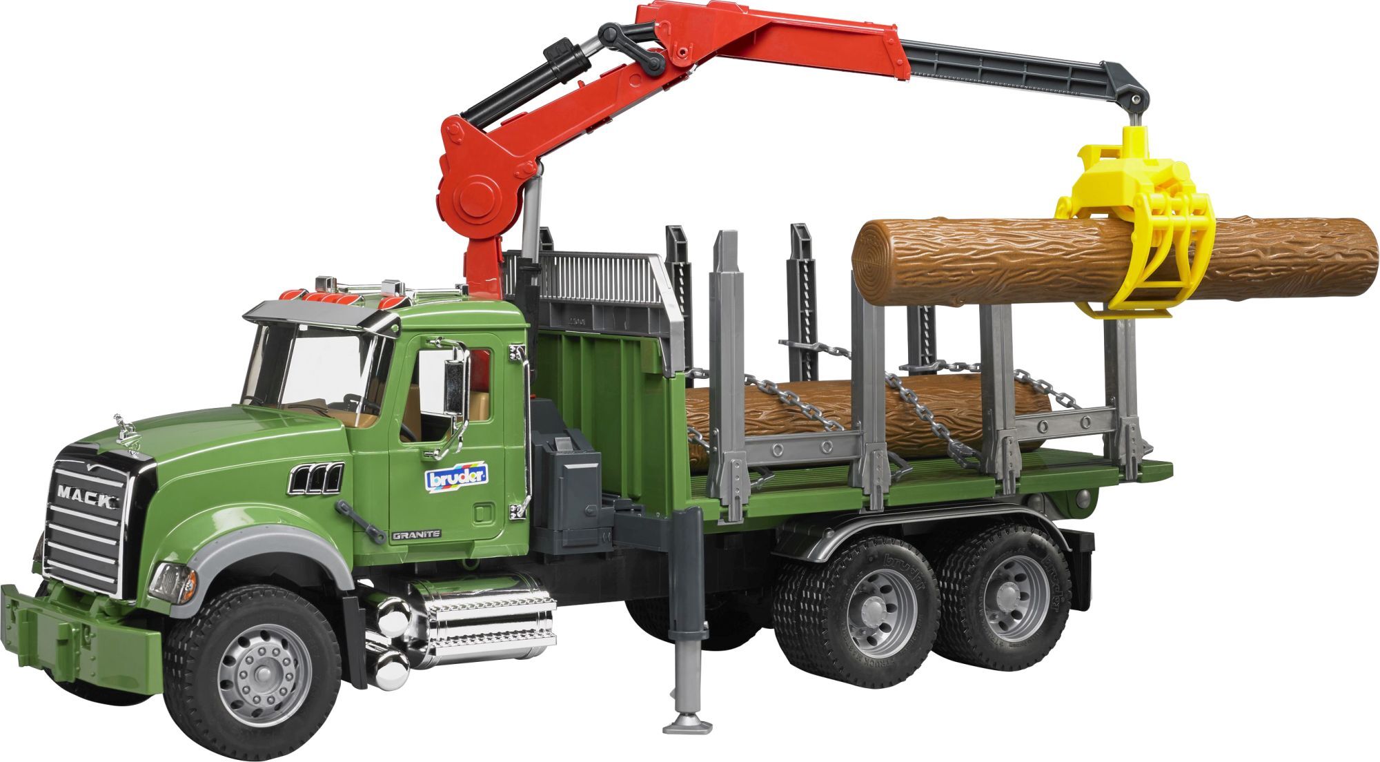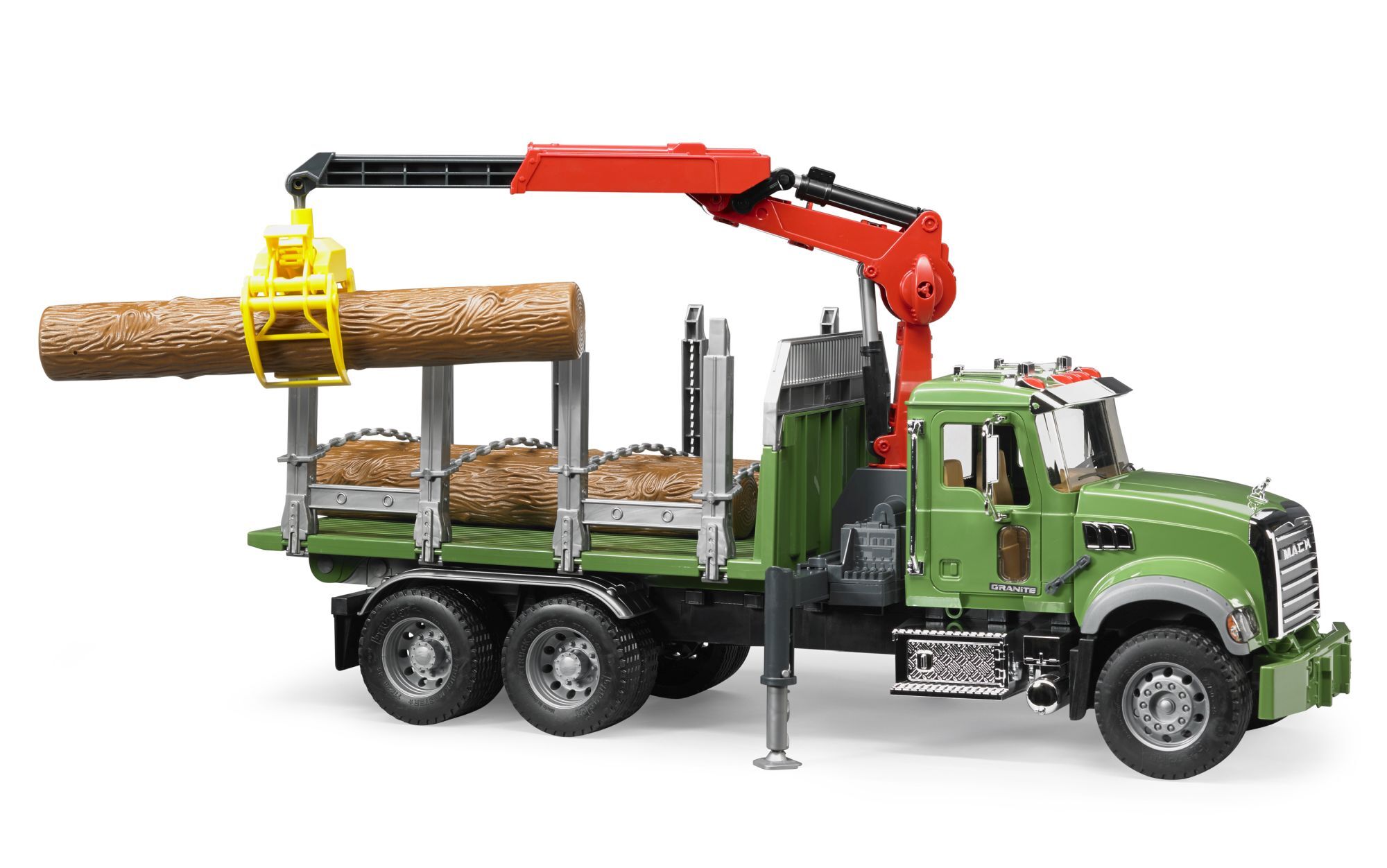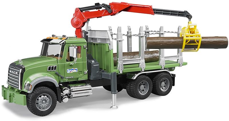 bruder 02824 MACK Granite Holztransport-LKW, Ladekran, Greifer + 3 Baumstämme ''Die Forstwirtschaft erlebt seit Jahren eine Renaissance aufgrund der Gewinnung von nachwachsenden Rohstoffen. Die zahlreichen BRUDER-Forstfahrzeuge werden durch den neuen MACK Holz...