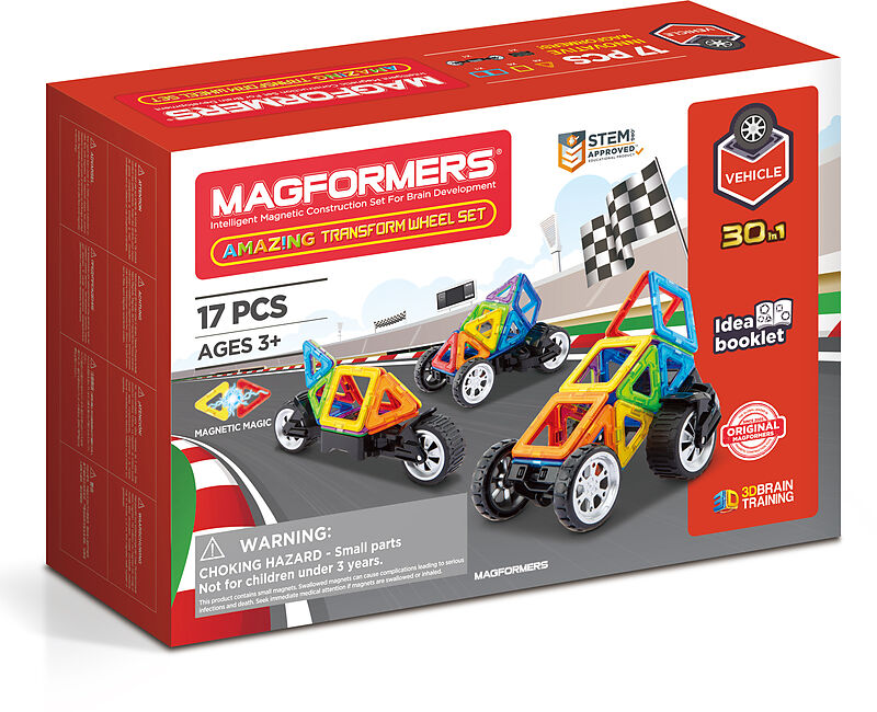 Magformers Amazing Transform Wheel Set 17 Teile Wroom! Jungs lieben Fahrzeuge auf Rädern. Die Startampel auf Grün und los gehts mit dem Konstruieren. Eben noch ein cooles Motorrad, wird daraus mit wenigen Handgriffen ein schnelles Auto. Dazu lassen sich die Ac...