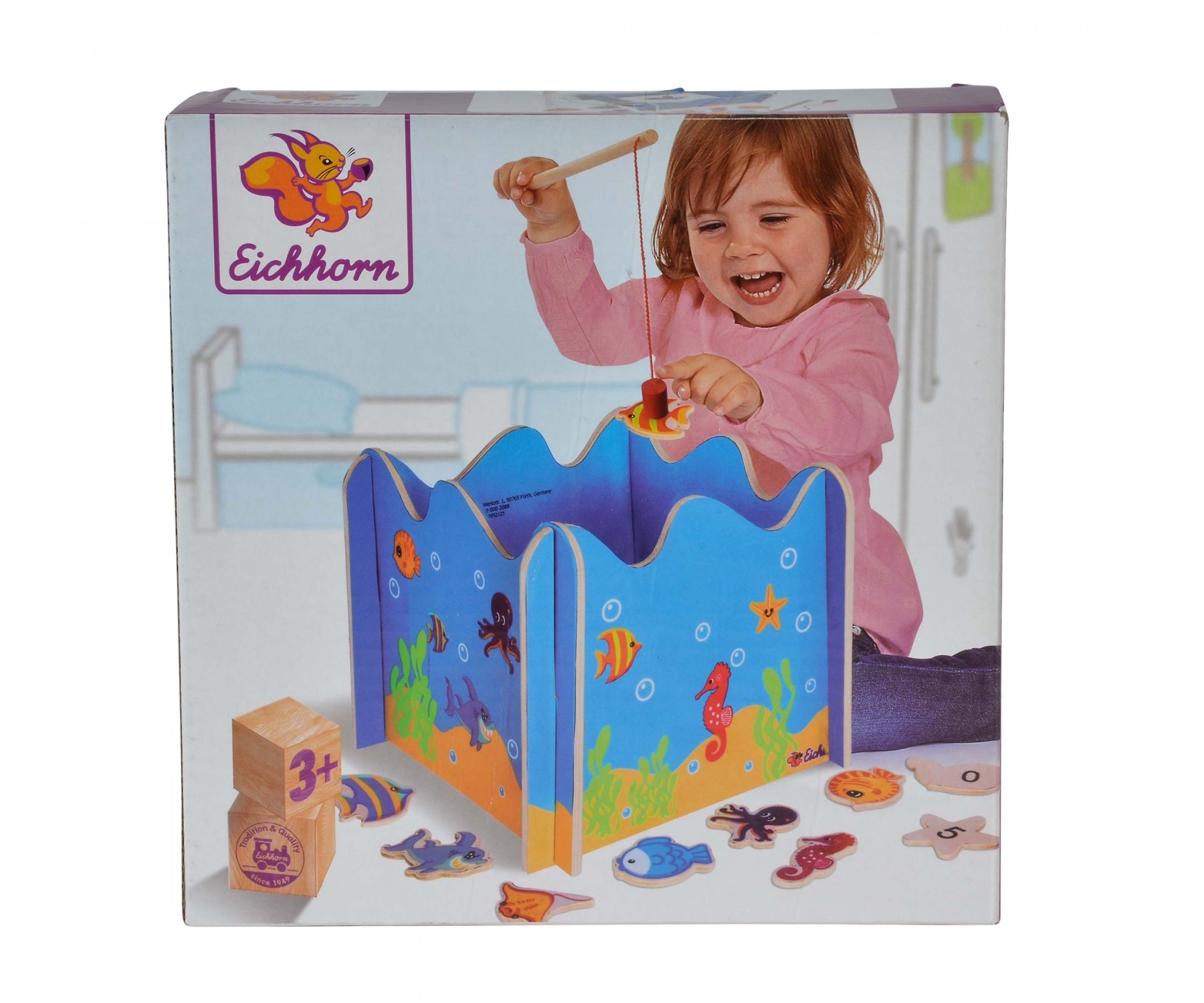 Eichhorn Angelspiel: Mit dem Eichhorn Angelspiel werden die tollsten Motive gefangen. An der Holzangel ist ein Magnet befestigt mit dem man die Fische und andere Meeresbewohner herausholen kann. Auf der Rückseite der Fische sind Zahlen aufgedruckt, jeder Spiel...