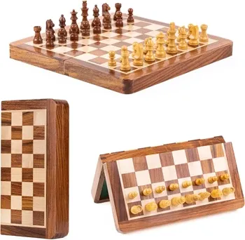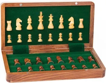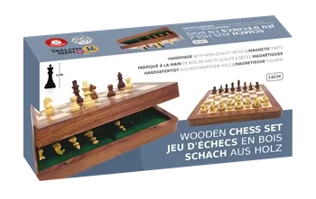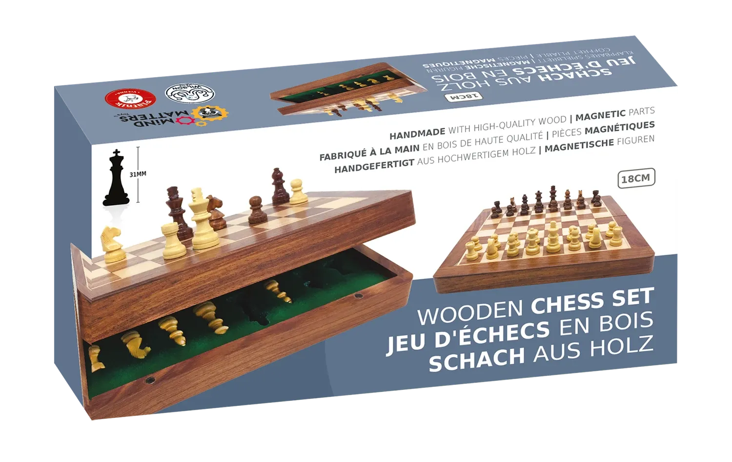 Ein handgefertigtes Schach aus hochwertigem Holz, besonders praktisch durch die magnetischen Spielfiguren und das zusammenklappbare Spielbrett. Durch die handliche Größe auch auf Reisen ein perfekter Begleiter. Königshöhe: 3,1cm, Spielfeld: 18x18cm