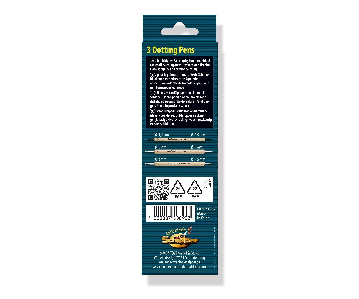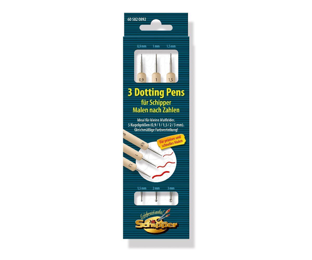 0.9mm/1.5mm, 1mm/2mm, 1.5mm/3mm, TB "3 Dotting Pens für Schipper Malen nach Zahlen" sind die praktische Alternative zum Pinsel. Die Fangemeinde wächst stetig und immer mehr Hobbymaler nutzen Dotting Pens für das Malen nach Zahlen. Dotting Pens bieten zahlreich...