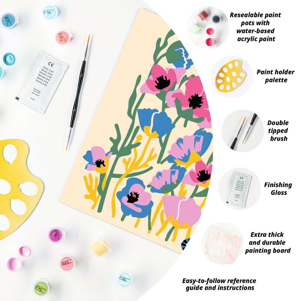 Inhalt: Maltafel im Format 20 x 20 cm, Acrylfarben auf Wasserbasis in wiederverschließbaren Näpfchen, Doppelpinsel, Farbpalette, Vorlageblatt, Glanzlack und Anleitung Ohne Rahmen!