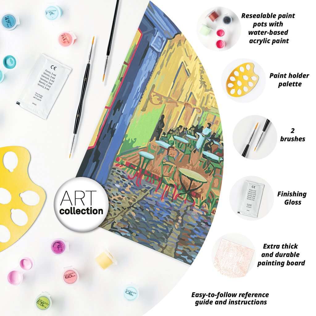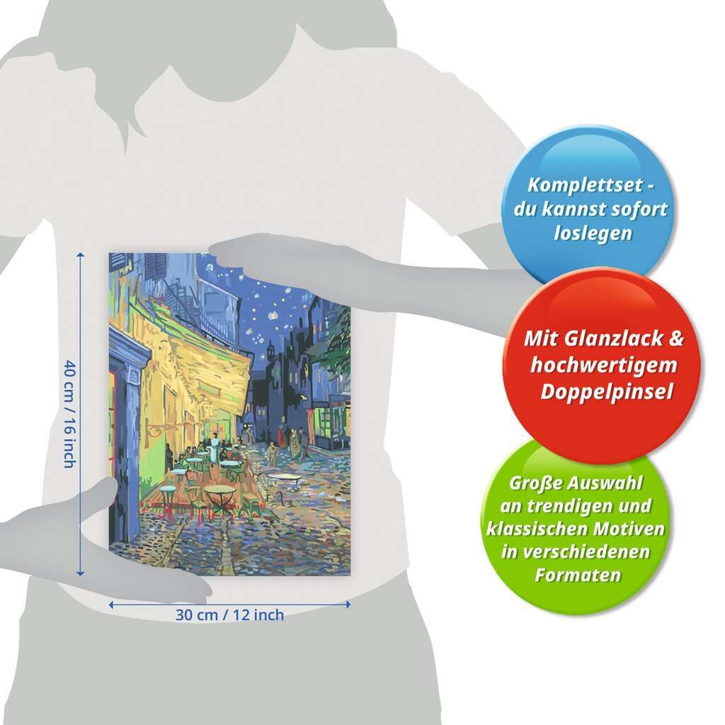 Mit CreArt - Malen nach Zahlen von Ravensburger findest du den Weg zur inneren Ruhe und Entspannung. Male weltbekannte Motive aus dem Museum: Das bekannte Gemälde "Café Terrace at Night" (Caféterrasse am Abend) des niederländischen Malers Vincent van Gogh gibt...