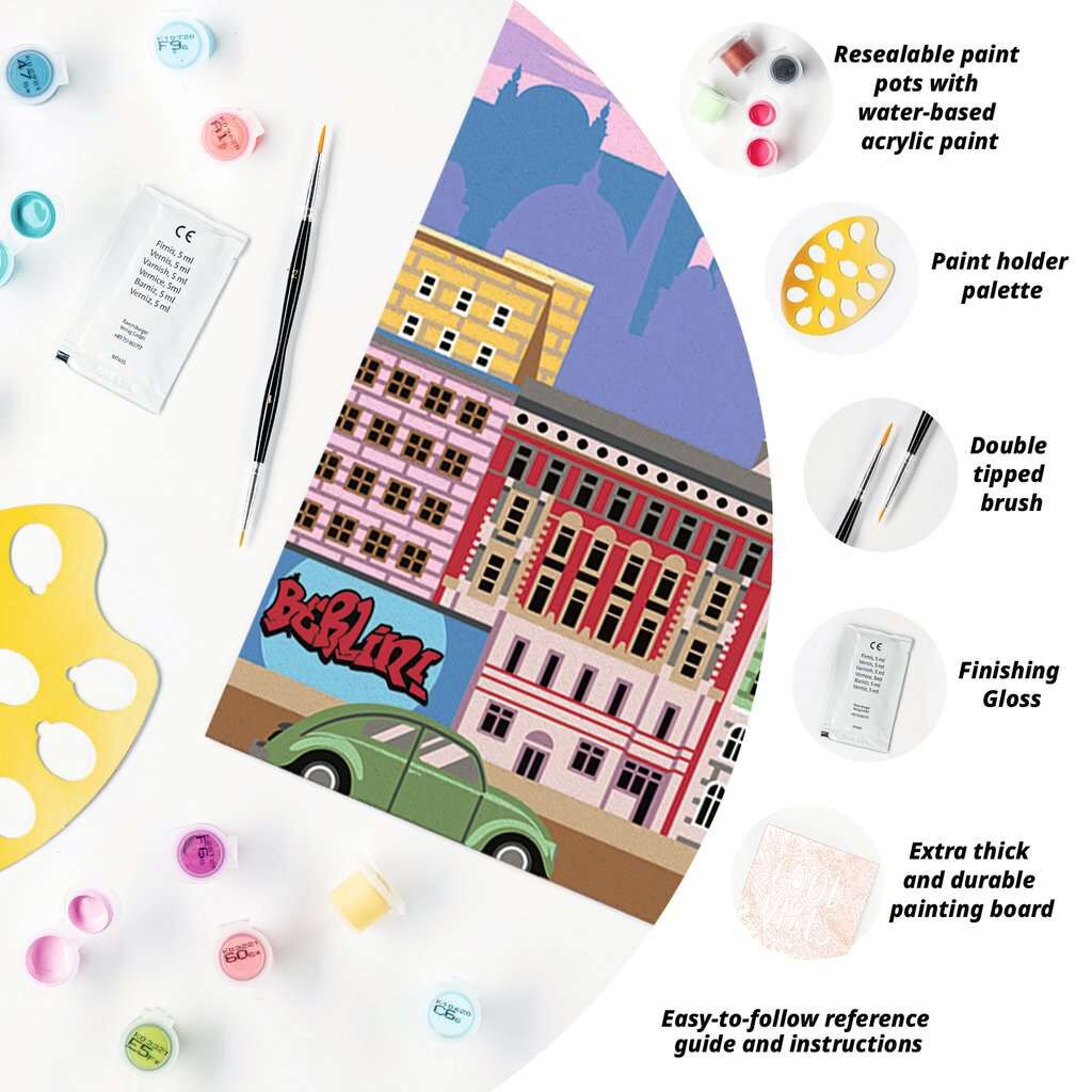 Inhalt Inhalt: Maltafel im Format 24 x 30 cm, 19 Acrylfarben auf Wasserbasis in wiederverschließbaren Näpfchen, Doppelpinsel, Farbpalette, Vorlageblatt, Glanzlack und Anleitung Ohne Rahmen!
