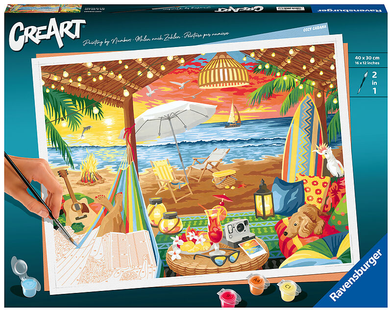 Gönnen Sie sich eine Auszeit vom Alltagsstress und malen Sie mit dem CreArt Malen nach Zahlen-Set diese #Gemütliche Cabana# an einem wunderschönen Strand! Entspannen Sie Ihren Geist und begeben Sie sich an einen Ort der Ruhe, ohne Bildschirme und ohne Verpflic...
