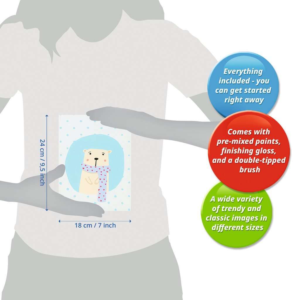 Inhalt: Maltafel im Format 18 x 24 cm, Acrylfarben auf Wasserbasis in wiederverschließbaren Näpfchen, Doppelpinsel, Farbpalette, Vorlageblatt, Glanzlack und Anleitung Ohne Rahmen