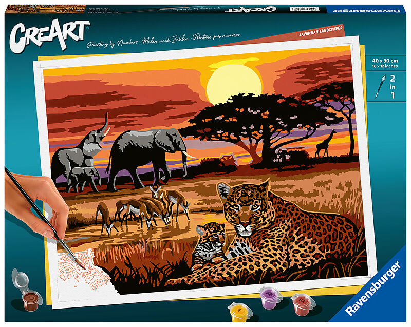 Das schöne CreArt Premium Motiv Savannah Landscapes von Ravensburger sorgt für großartigen Malspaß für Erwachsene ab 14 Jahren und pure Entspannung. Die Motivlinien sind bereits aufgedruckt und nummeriert und werden mit den bereits fertig gemischten Acrylfarbe...