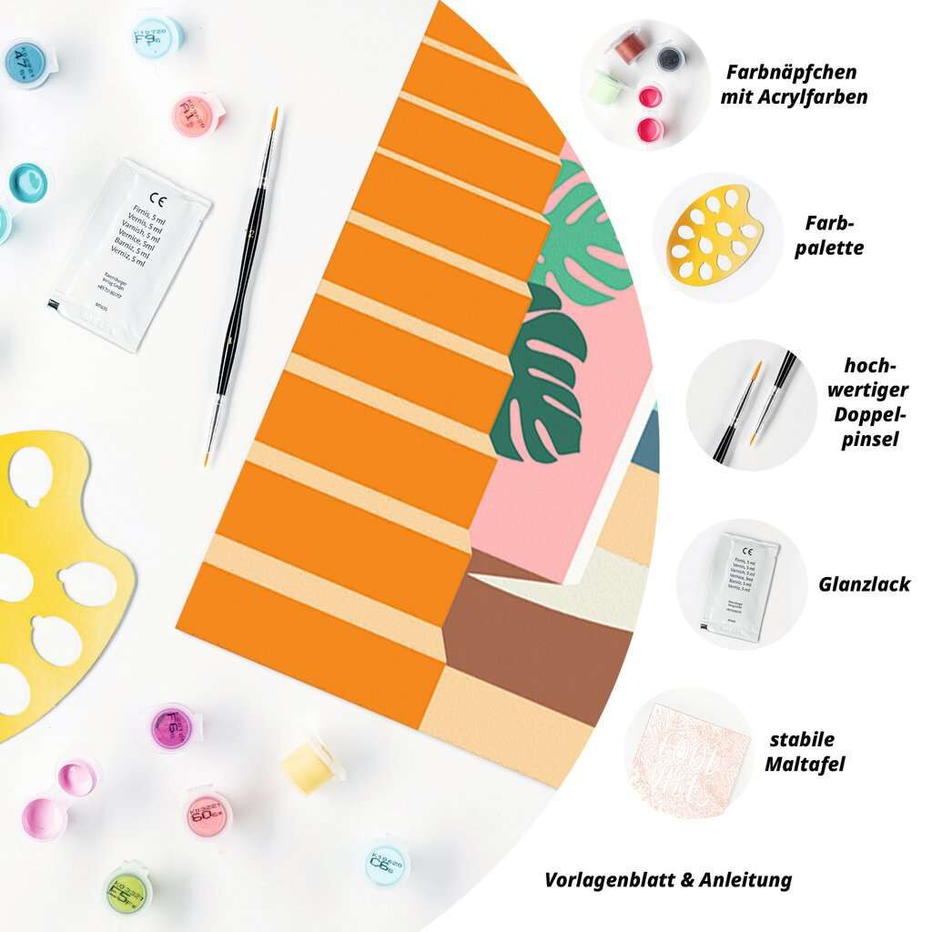 Inhalt: 1 Maltafel (Format 24x30 cm), 13 Acrylfarben auf Wasserbasis in wiederverschließbaren Näpfchen, 2 Qualitätspinsel, Farbpalette, Bildaufhänger, Vorlageblatt und Anleitung.