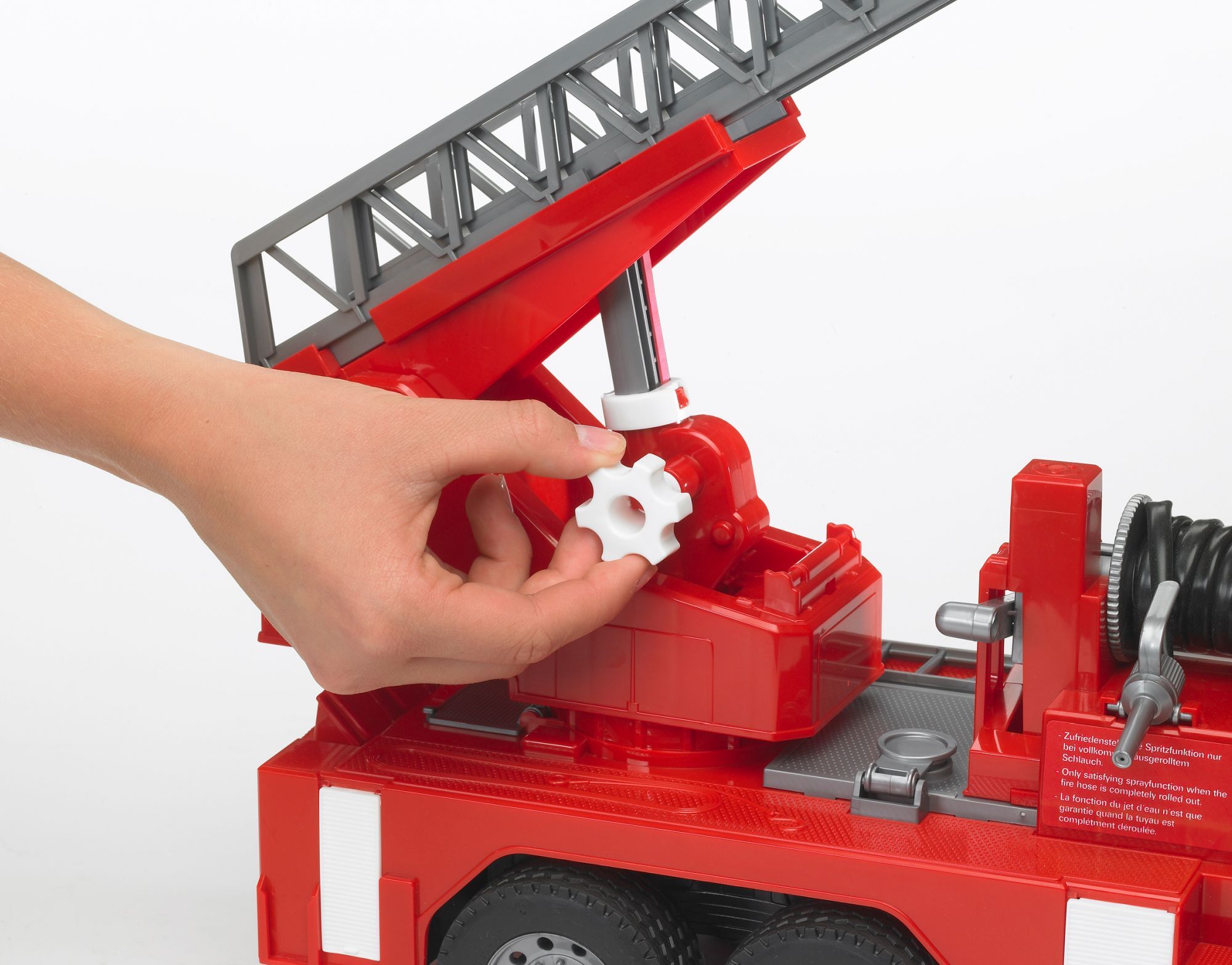 Bruder 02771 MAN Feuerwehr mit Drehleiter, Licht und Sound Das kippbare Fahrerhaus des MAN Feuerwehr-LKWs mit Drehleiter und Wasserpumpe ermöglicht die Sicht auf den Motorblock. Die Spiegel des Fahrerhauses lassen sich ausklappen und der integrierte Wassertank...