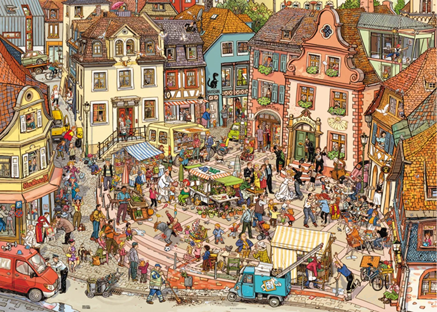 Detailgenau wie immer zeigen Doris Göbel und Peter Knorr das pralle Leben auf dem Marktplatz. Es wird getratscht, gefeilscht, getanzt und geheiratet. Und vieles mehr! Gelegte Größe: 70x50 cm.