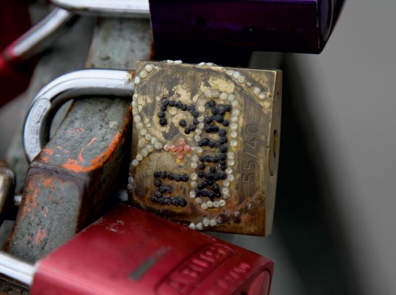 Dieser Kalender zeigt die überaus beliebten Liebesschlösser einmal ohne Glanz und Glimmer. An ihnen hat bereits der Zahn der Zeit genagt. Farbe die abbröckelt, Namen die kaum noch lesbar sind.