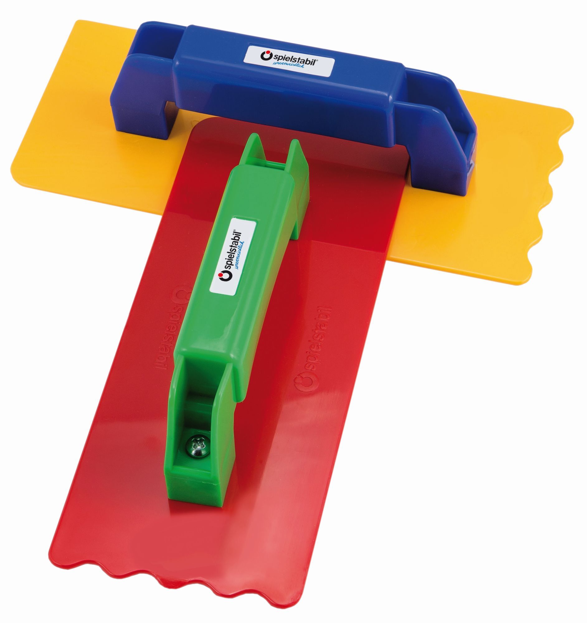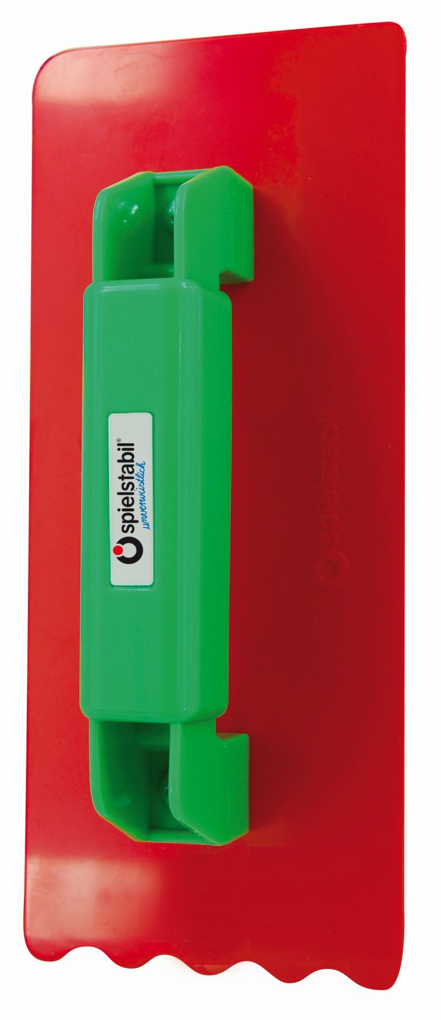 SPIELSTABIL Maurerglätter. Mit sehr stabilem Griff, sehr schön zum Sandspielen: eine Seite glatt, die andere mit wellenförmiger Zierkante, mit einer spitzen und einer runden Ecke, Größe 19 cm.