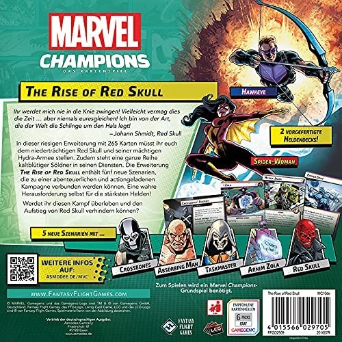 Die Kampagnen-Erweiterung The Rise of Red Skull bietet viele neue Inhalte und bereichert Marvel Champions: Das Kartenspiel. Hawkeye und Spider-Woman gesellen sich zu der Heldenriege mit komplett vorgefertigten und spielbereiten Spielerdecks, die mit neuen Kart...