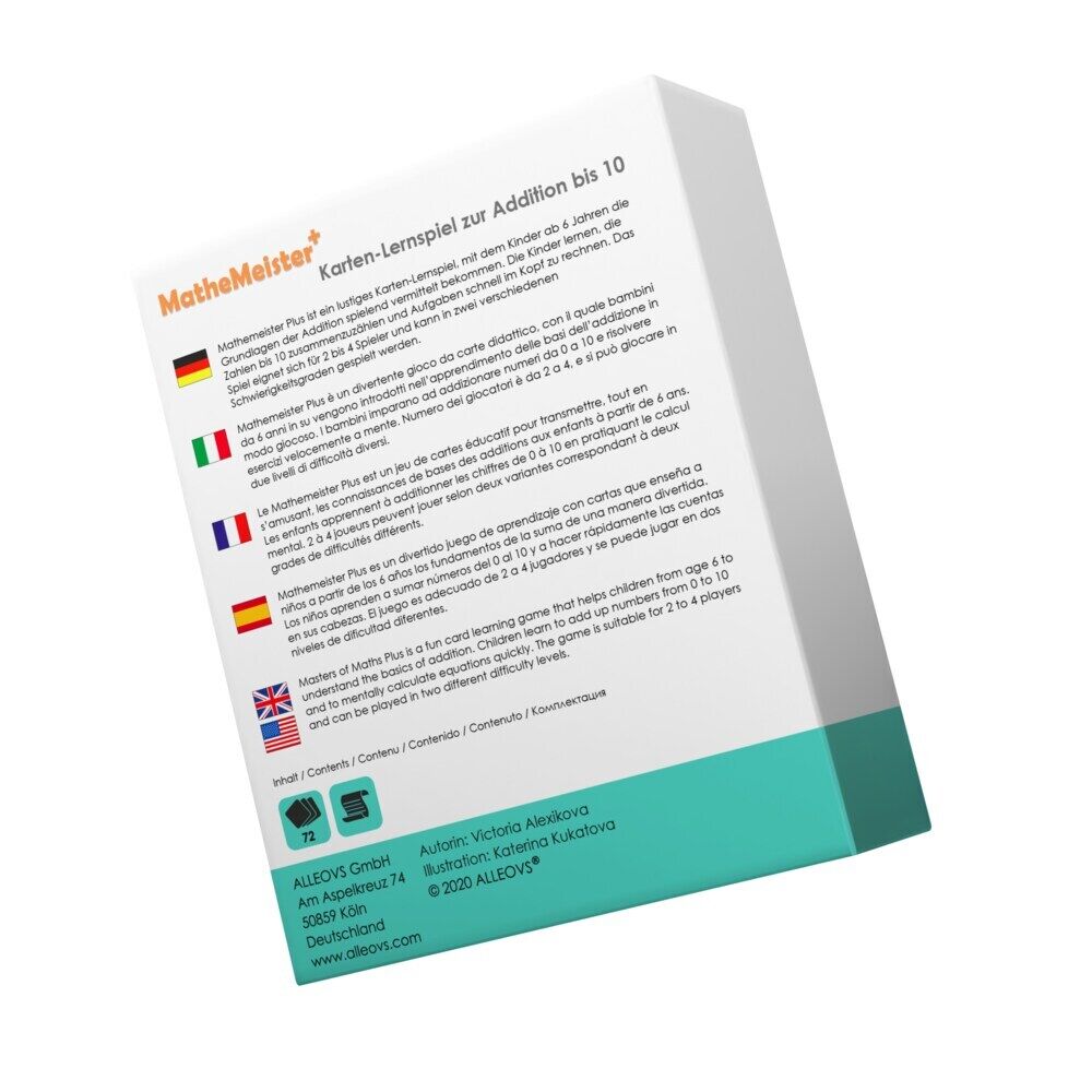 Mathemeister-Plus ist ein lustiges Karten-Lernspiel, mit dem Kinder ab 6 Jahren die Grundlagen der Addition spielend vermittelt bekommen. Die Kinder lernen, die Zahlen bis 10 zusammenzuzählen und Aufgaben schnell im Kopf zu rechnen. Das Spiel kann in zwei vers...