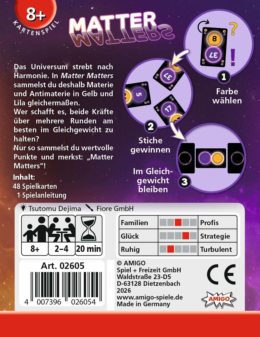 Matter matters Das Universum strebt nach Harmonie. In Matter Matters sammeln die Spielenden deshalb Materie und Antimaterie in Gelb und Lila gleichermaßen. Dafür müssen sie sich vor jeder Runde entscheiden, welche der beiden Farben sie ausspielen, um den Stich...