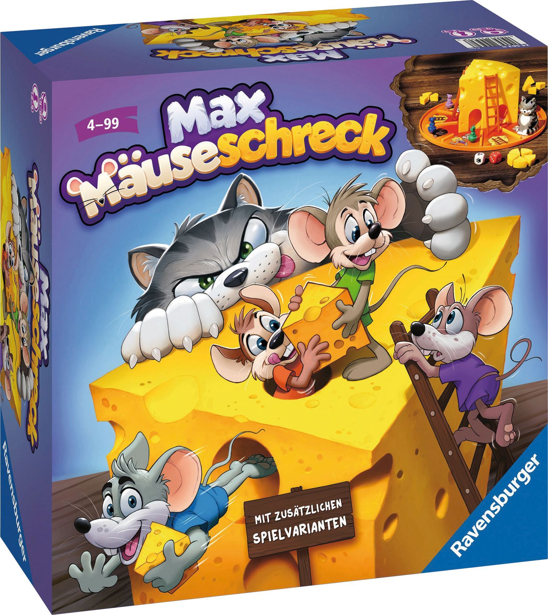 Ravensburger 24562 Max Mäuseschreck Lustige Kinderspiele Leckerer Käse! Welche kleine Maus will davon nicht die meisten Ecken einsammeln? Je nachdem auf welches Feld die Mäuse bei ihrem Zug ziehen, dürfen ein oder zwei Stück Käse aus dem Vorrat genommen werden...