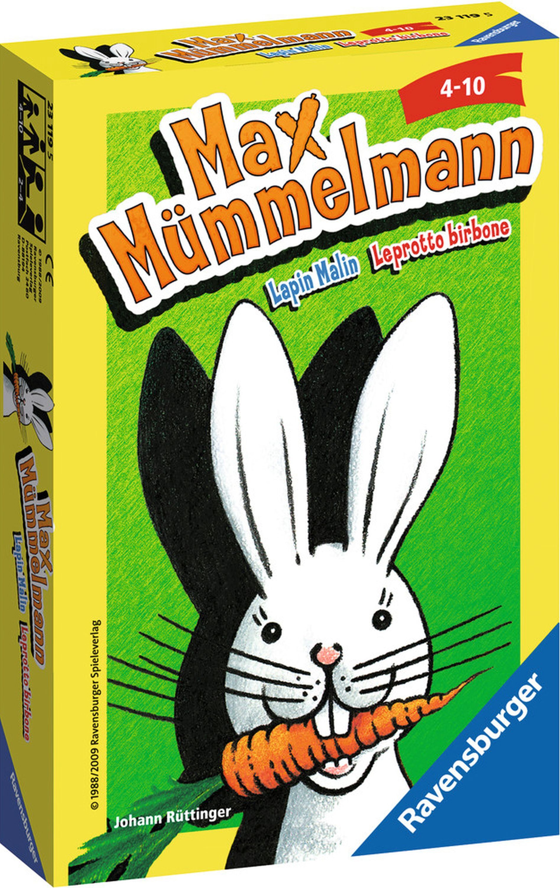 Bei dem Ravensburger Spiel Max Mümmelmann versucht jeder Spieler eine Hasenfamilie zu sammeln. Doch eine ganze Hasenfamilie zusammenzubringen, ist gar nicht so leicht, denn der freche Max pfuscht immer dazwischen. Zuerst heißt es Würfeln und Ziehen, der Hase M...