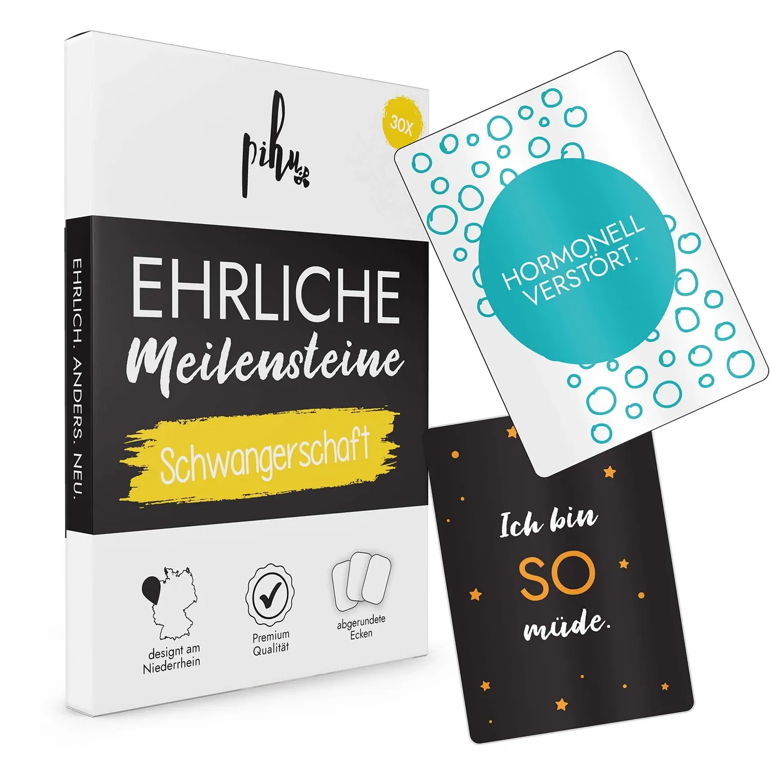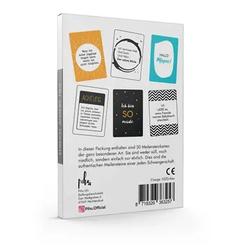 In dieser Packung enthalten sind 30 Meilensteinkarten der ganz besonderen Art. Sie sind weder süß, noch niedlich, sondern einfach nur ehrlich. Dies sind die authentischen Meilensteine einer jeden Schwangerschaft.
