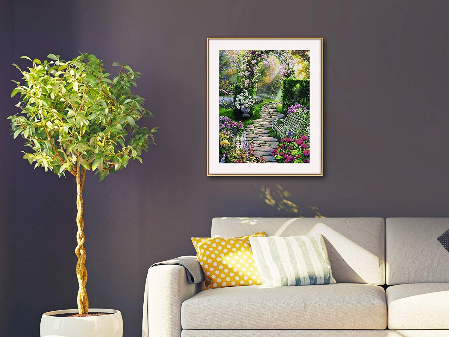Der Garten ist eine Wohlfühloase im Alltagstrubel. Die stilvolle Bank im Vordergrund des Bildes ist eingebettet in ein farbenprächtiges Blütenmeer. Der Ort strahlt Ruhe aus und lädt zugleich zum Verweilen ein. Ein sanft gewundener Weg führt durch ein Rosenspal...
