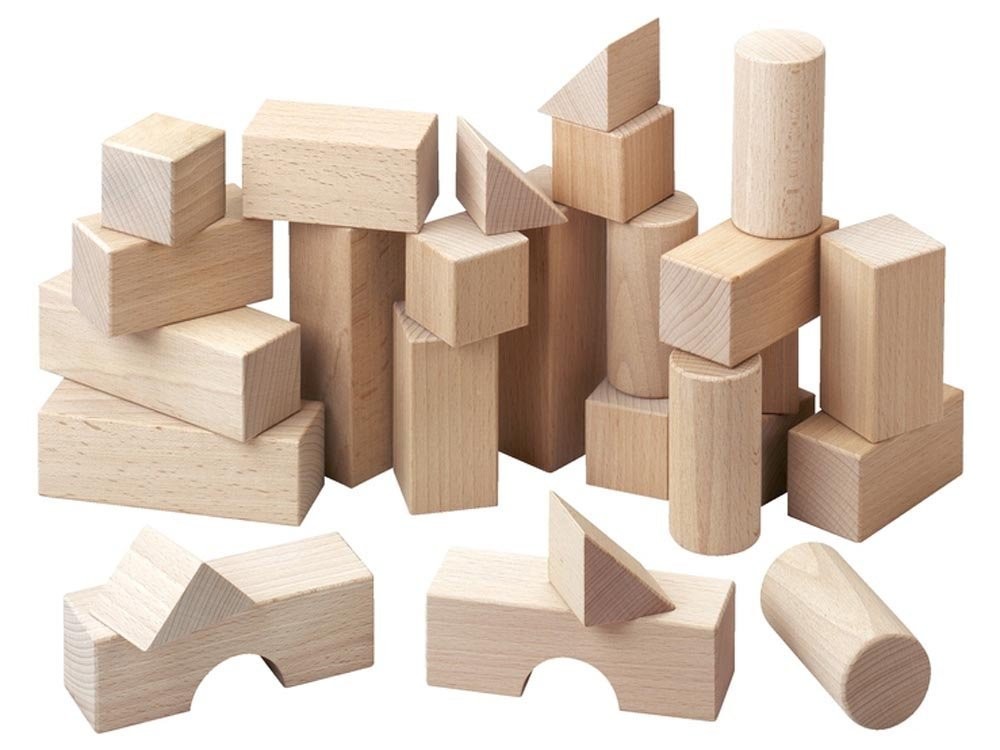 Inhalt: 6 Würfel, 10 Quader, 4 Dreiecke, 2 Brücken, 4 Rundsäulen.