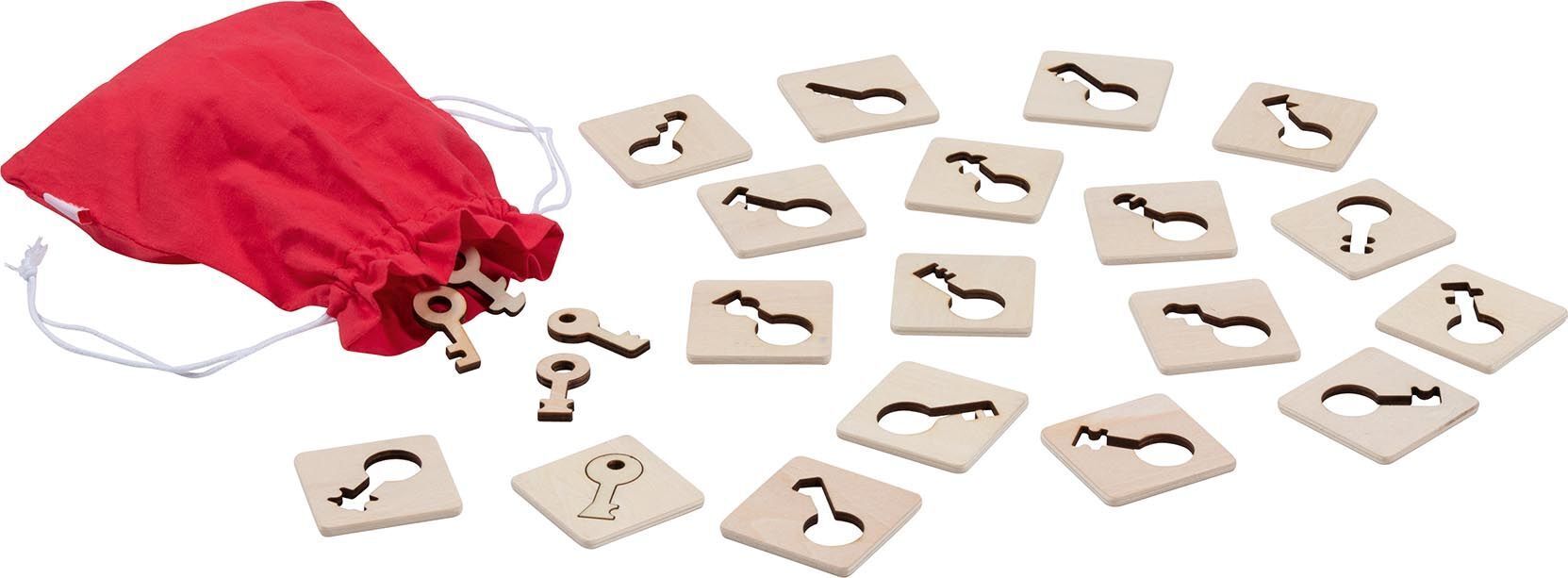 Schnelligkeit ist Trumpf bei diesem Memory aus Holz. 16 Schlüssel passen in 16 Kärtchen. Doch die Spieler müssen genau schauen. Denn jedes Paar gibt es nur einmal. Und wenn der Schlüssel aus dem Beutelchen gezogen wird, wer zeigt dann am schnellsten auf das Ge...
