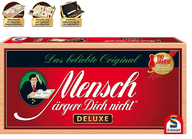 Mensch ärgere Dich nicht ® Deluxe Die Mensch ärgere Dich nicht-Deluxe Version in edler Holzschatulle mit großem Spielmaterial und elegantem Magnetverschluss. Dank des praktischen Inlays aus Schaumgummi kann das Spielmaterial schön verstaut werden. Die Holzscha...