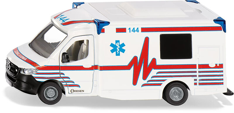 Schweizer Rettungsfahrzeug mit vielen Funktionen - Sirene und Blaulicht an. Die Rettungsassistenten rasen mit dem Mercedes-Benz Sprinter Miesen Typ C Rettungswagen zum nächsten Einsatz. Im Notarztwagen ist der Notarzt unterwegs. Jede Minute zählt. Mit der Trag...