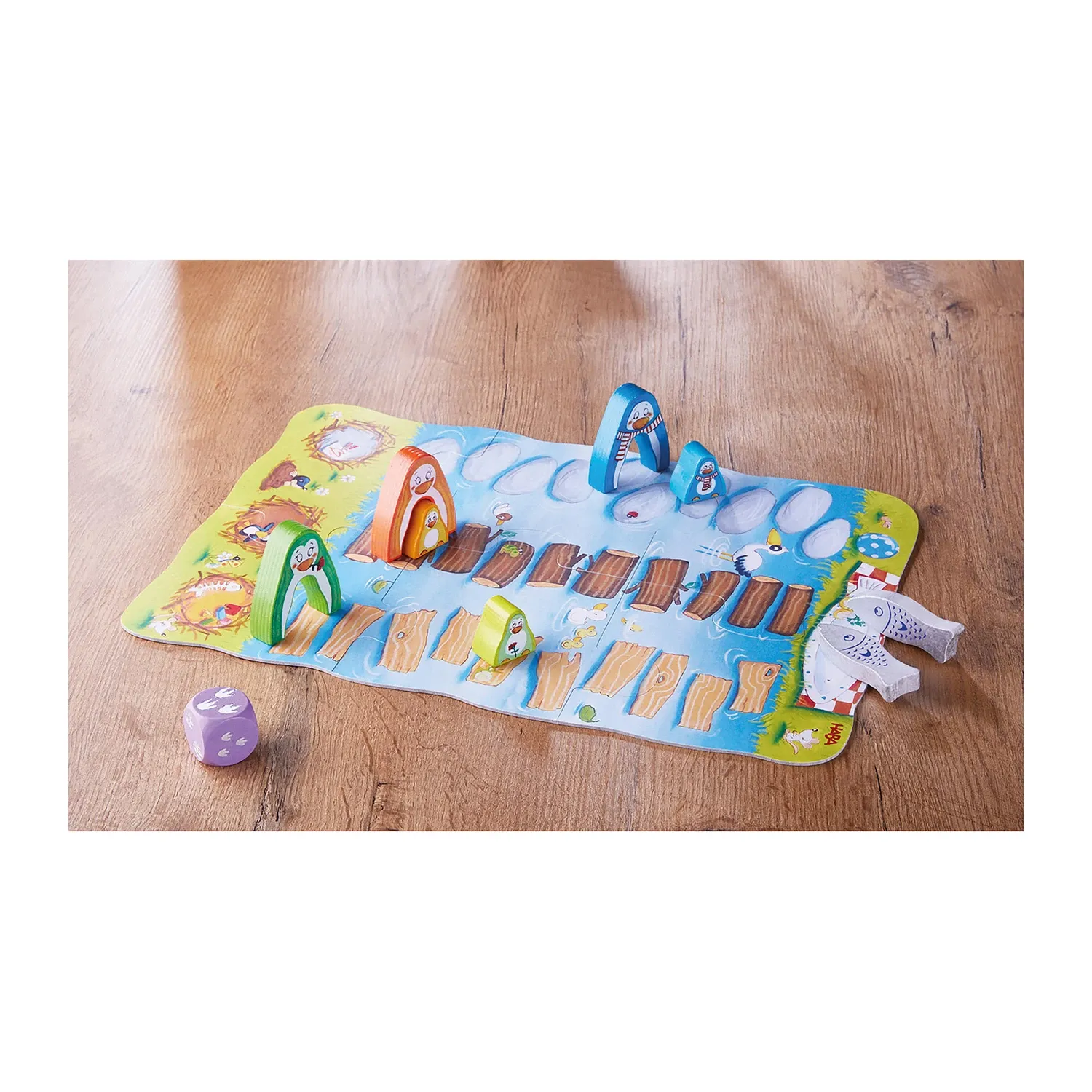 Les pingouins habitent tous ensemble sur une île. Mais les délicieux poissons du pique-nique se trouvent sur la terre ferme! Heureusement, il y a suffisamment de troncs d'arbre, de rochers et de planches qui flottent sur l'eau pour permettre aux bébés pingouin...
