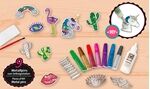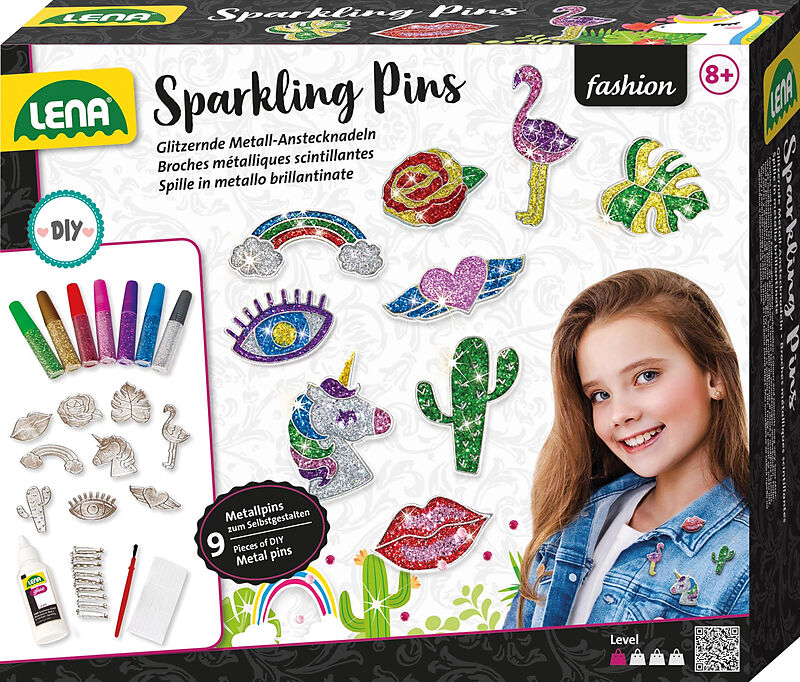 Stylische Glitzer-Anstecker selbst gestalten! Das Set enthält 9 trendige Motive aus Metall mit Sicherheitsnadeln sowie 7 Glitzer-Farben, eine kleine Bürste, einen Zahnstocher und Kleber, um die Pins zu gestalten. Mit farbiger Anleitung.