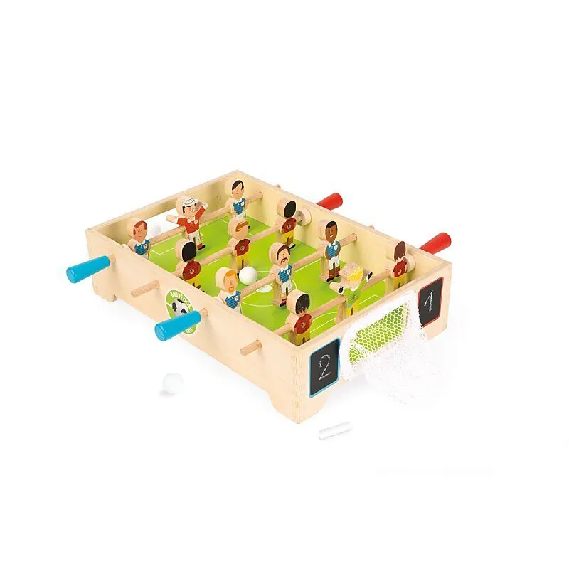 Mini Tischfussball aus Holz, 2-5 Spieler, 32.5x29.5x8cm. Veranstalte Fussballturniere mit deinen Freunden und bringe den Pokal nach Hause! Werde der beste Torjäger der Meisterschaft, indem du die meisten Punkte gegen deinen Gegner verzeichnest. 3 Bälle im Lief...