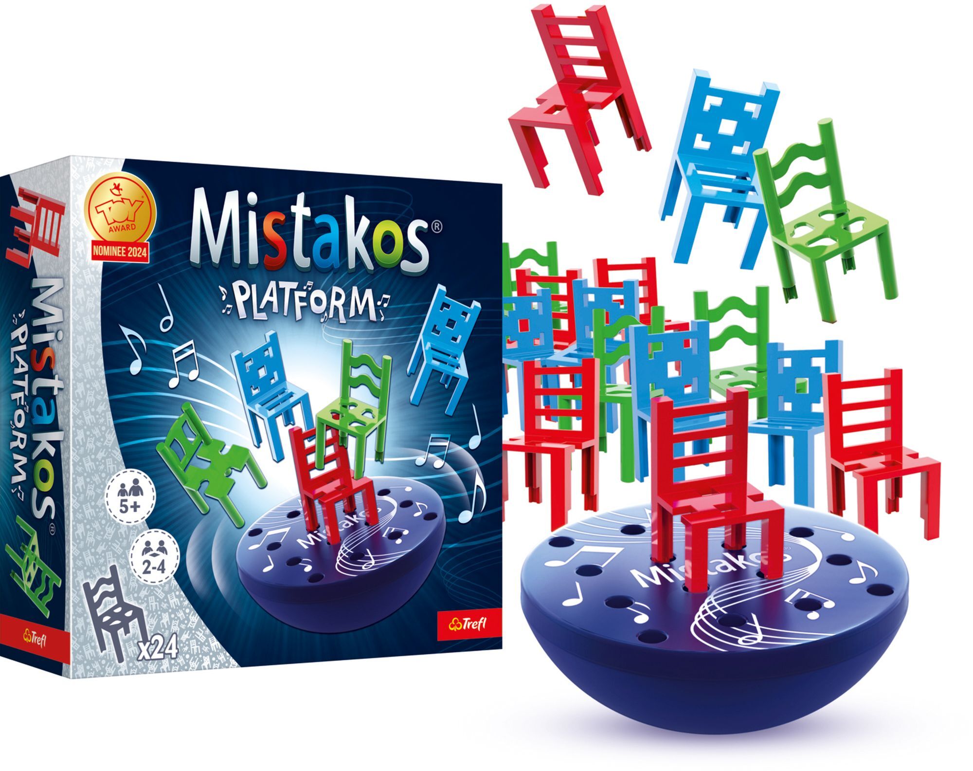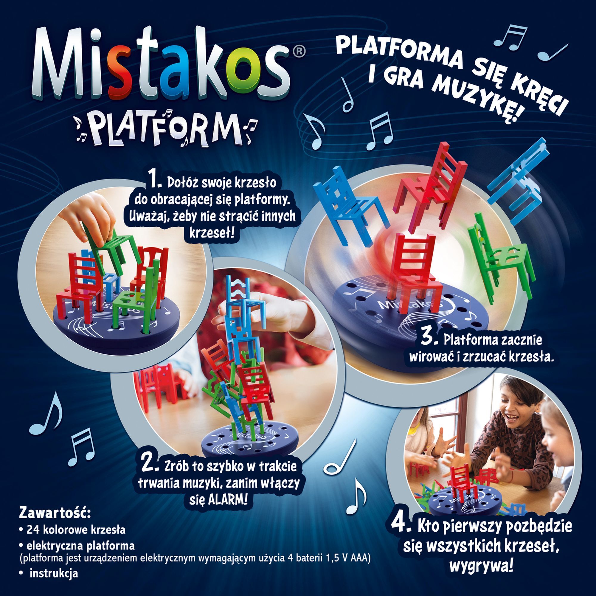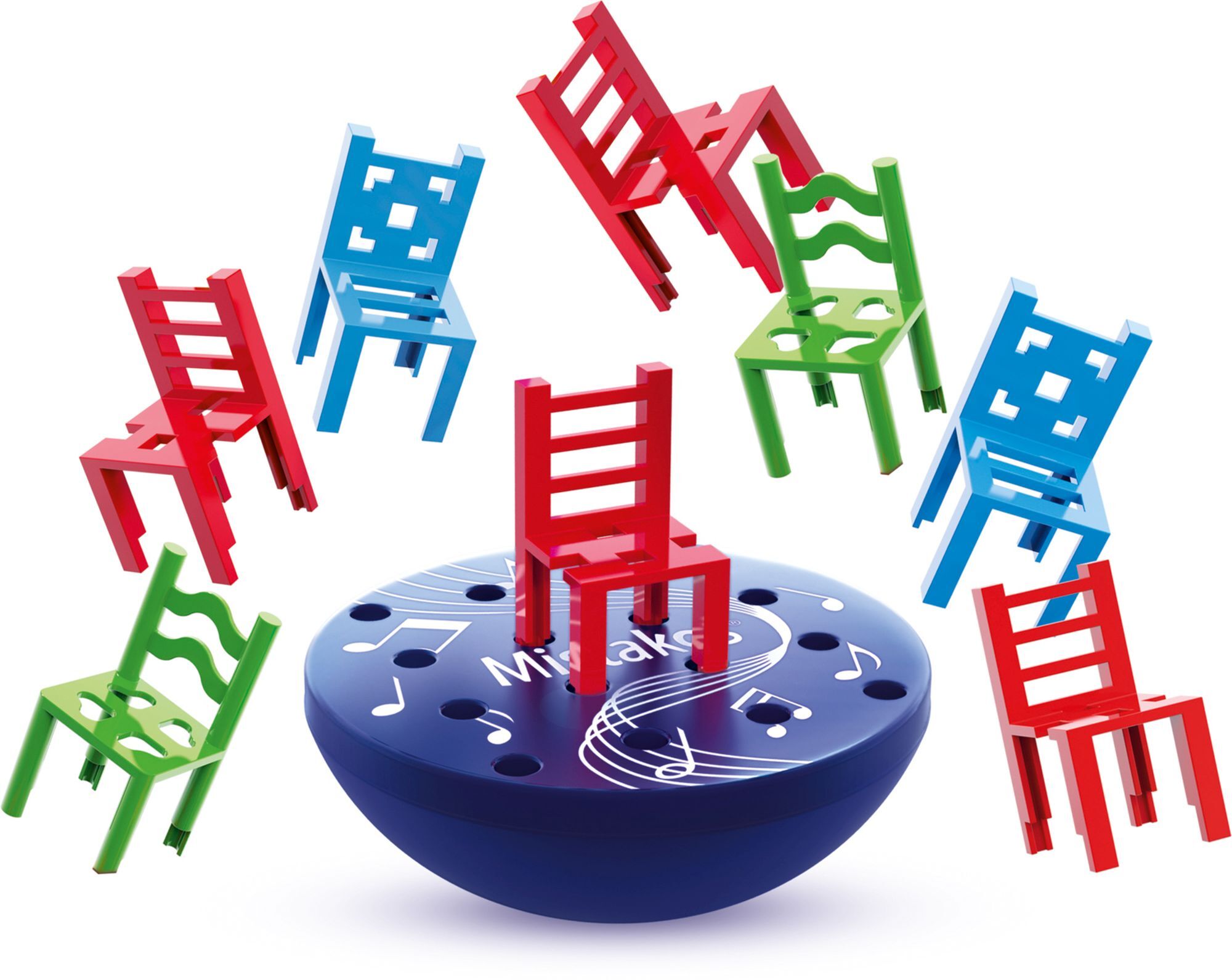 MISTAKOS Plattform. Ziel des Spiels ist es, beim Stapeln der Stühle auf der drehenden mit Musik spielenden Plattform möglichst wenig Strafpunkte zu erzielen.