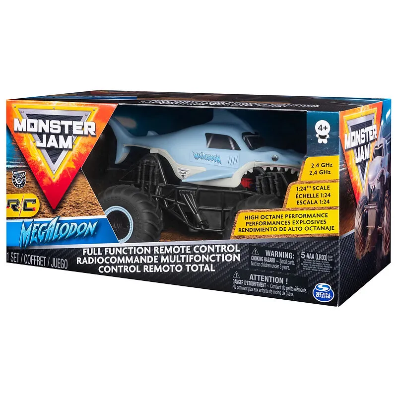 Der offizielle Megalodon: Im Maßstab 1:24 zum ersten mal mit Fernsteuerung. Dieser Monster Jam-Truck ist voll ausgestattet mit Reifen des offiziellen Sponsors BKT und einem realitätsgetreuen Fahrgestell für maximale Authentizität. Bereit loszulegen: Die 2,4 GH...