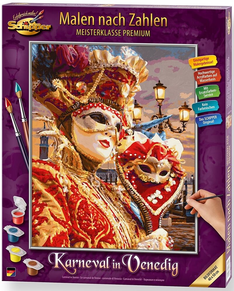Schipper - Meisterklasse Premium; Malen nach Zahlen - Maltafel 40 x 50 cm mit Leinenstruktur. Malfertig vorgemischte Acrylfarben und Malpinsel mit Kontrollblatt und ausführlicher Anleitung. Sprachen: D/GB/F/I/NL/RUS Der Karneval in Venedig hat eine lange Tradi...