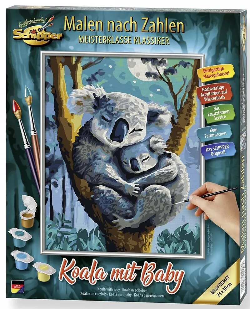 Größe: 24x30 cm Altersempfehlung: ab 12 Jahren Erschaffe mit Koala mit Baby von Schipper Malen nach Zahlen ein Herz erwärmendes Kunstwerk für dein Zuhause. Dieses liebevoll gestaltete Set ermöglicht es dir, die starke Bindung zwischen Mutter und Kind in der Na...