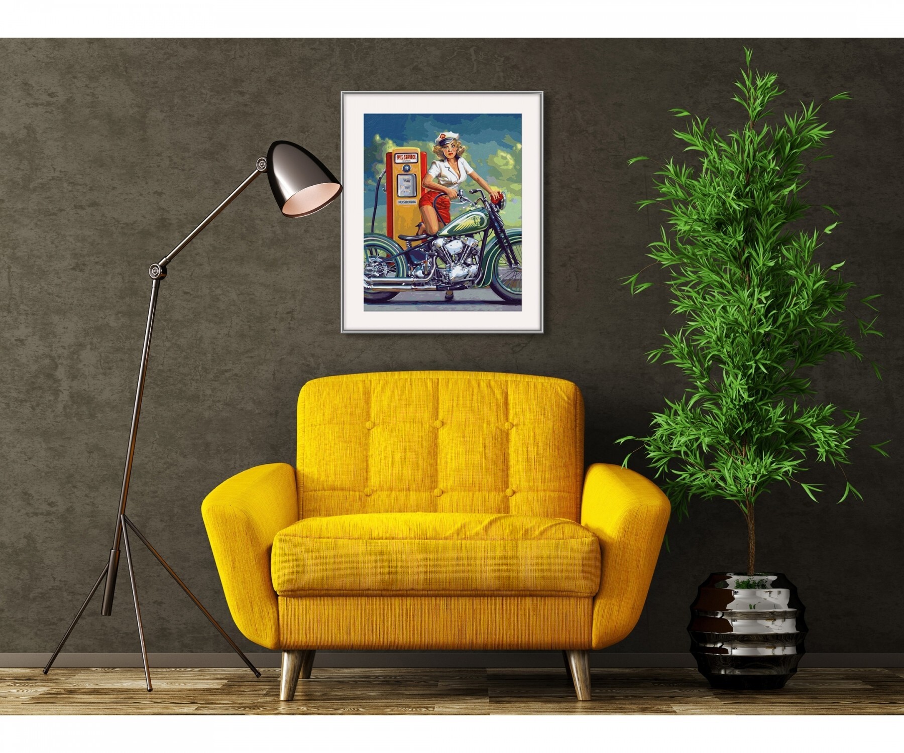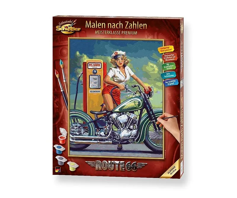 Die legendäre Route 66, die von Chicago nach Los Angeles führt, war im letzten Jahrhundert der Inbegriff von Freiheit und Mobilität in den USA. Sie gilt auch heute noch als Motorrad-Traumstraße. Das im Stil eines Werbeplakats der 50er Jahre gehaltene Motiv hul...